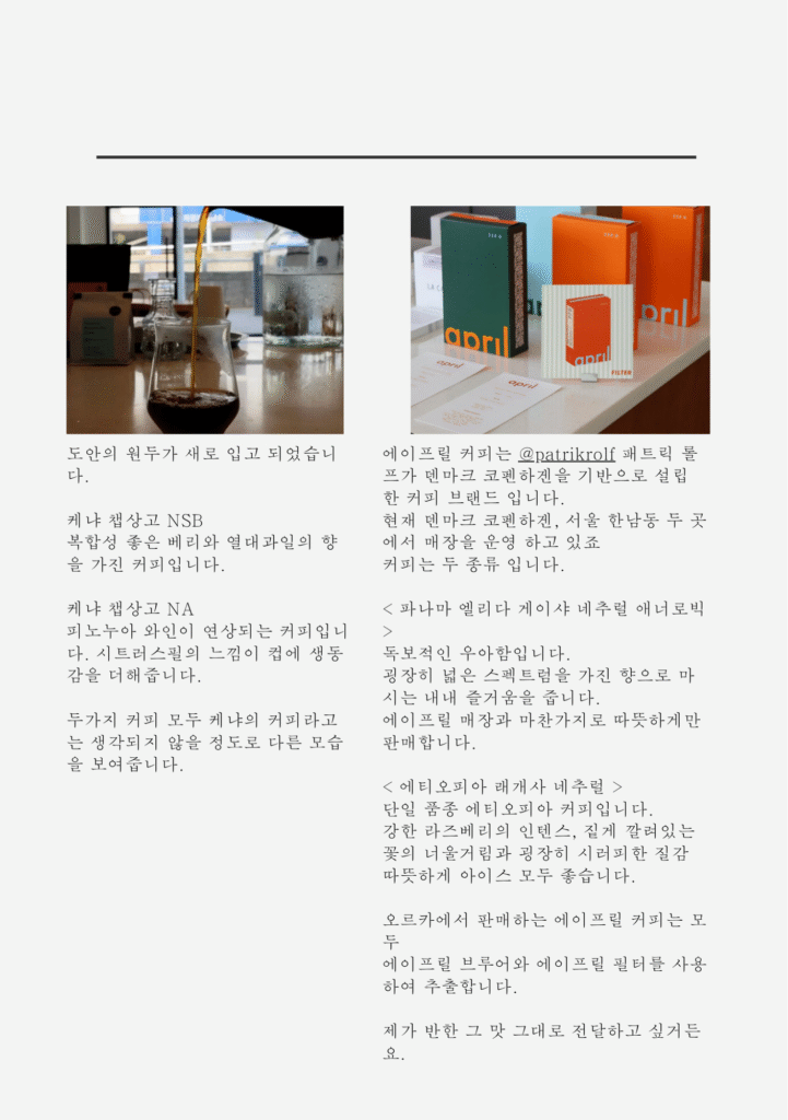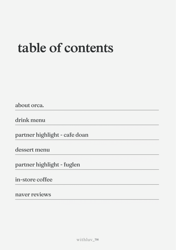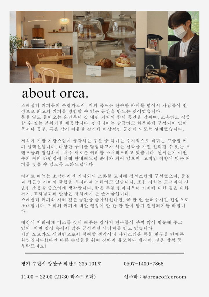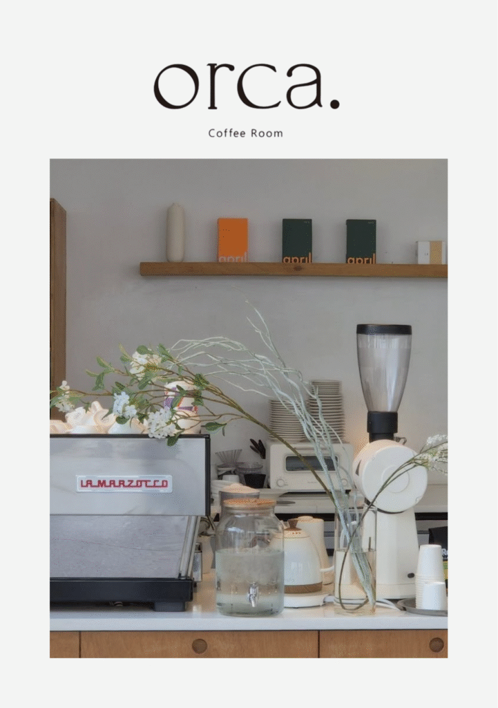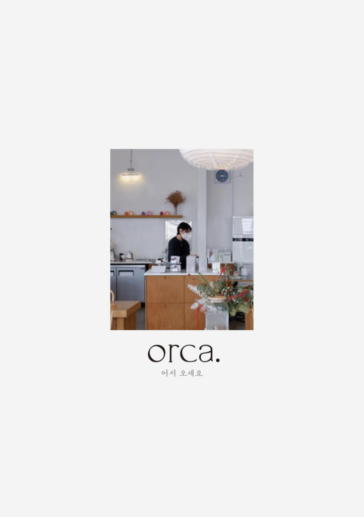 그 결과, Orca가 지닌 따뜻하고 세련된 분위기, 고품질 커피에 대한 열정, 그리고 조용하고 편안한 공간의 감성을 담은 미니 매거진이 완성되었습니다.